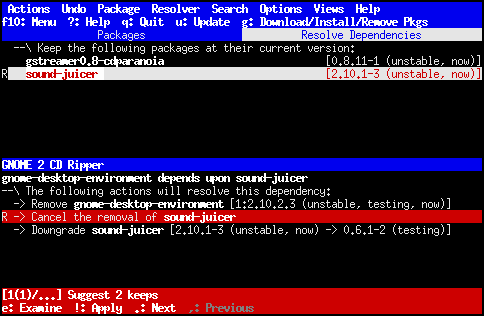 Por ejemplo, si este rechazo (a una solución) se impone inmediatamente después de intentar eliminar sound-juicer, pulsar . nos llevaría a la siguiente solución, omitiendo la solución que cancela la instalación de sound-juicer y que desactualiza gstreamer0.8-cdparanoia.